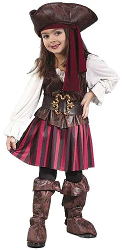 Girl’s Pirate Shirt w/attached VestPink Striped SkirtMatching BandanaPirate Belt w/BuckleLeather-Look Pirate HatLeather-Look Boot TopsThis Caribbean toddler pirate girl costume will be a hit with the rest of the crew! The shirt and sleeves are 100% knit polyester. The vest laces up in the front and looks like leather because of it’s distressed appearance. Elastic in the waist adds to the costume’s comfort. Attached at the waist is a striped red and black skirt. The brown belt which is made out of pleather closes with Velcro in the back and includes a gold-colored buckle. The boot covers match the vest with their leather-like appearance and have elastic bands to secure them. Finally, the matching leather-like hat and dark red bandana add the finishing touches to this classic little pirate costume. Check out our accessories like boots, swords, and eye patches!