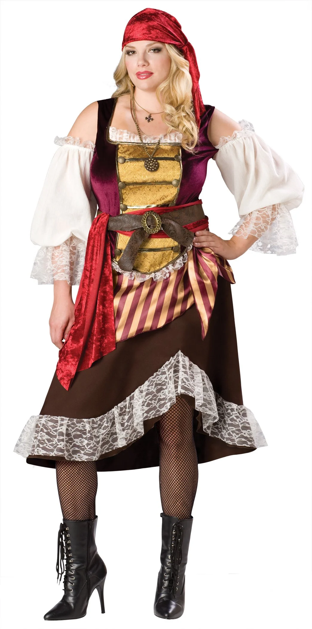 You’ll be a desirable distraction on deck in this sultry ensemble this Halloween! The Deckhand Darlin’ Plus Adult Costume includes a beautiful off the shoulder dress with lace trim skirt, a brown belt, a brilliant contrasting red waist sash, and a matching head scarf. Sure to be the fiercest sea fairing’ maiden on the seven seas!