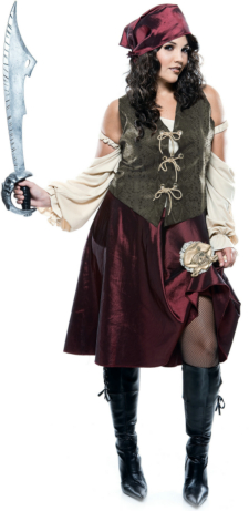 This mate-ess is sailing the high seas for her one-and-only pirate mate. Sail your ship in her direction and she might just pick you! The High Seas Pirate Adult Plus Costume includes a burgundy-skirted dress with white top, a brown lace-up vest, a burgundy head scarf, tan puffy sleeves, and a gold skull pin.