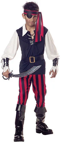 Boy’s Pirate ShirtCropped Polyester PantsBlack BeltBoot CoversStriped Head TieWrist CuffsTransform your child into a rebellious pirate with this Kid’s Cutthroat Pirate Costume. The polyester shirt laces up in the front and has jagged edged sleeves. The black and red striped pants match the black and red headband. Also included is a pair of vinyl cuffs, black boot covers (also made of vinyl), and an easy-to-adjust black belt with a decorative gold buckle. Don’t forget to add a sword to make the pirate look even more authentic!
