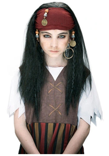 Child pirate wigYour child can complete their Caribbean pirate costume with this kids pirate wig! The pirate wig is made of synthetic black hair that goes past the shoulders in length. Attached to the wig is a red bandana and a few beaded accessories. This pirate wig is great with our child Jack Sparrow costume!