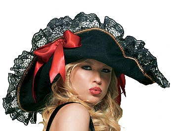 Black Velvet Hat w/Lace TrimMeasures Approximately 20” LongAdd some sass to any ladies pirate costume with this Sexy Pirate Hat! This foam hat is covered in black velvet and the brim is decorated with gold-colored material. The detailed black lace which covers the hat gives it an intricate, sexy look. To add a touch of classiness, there is a red bow on either side. After you put this hat on you’ll have to fight the pirates off with your sword!