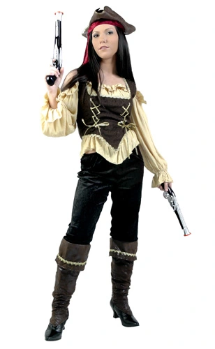 CorsetShirtPantsHatBoot TopsSet sail in this women’s rustic pirate costume! The exclusive costume includes a tan peasant top that is made from polyester and has off-the-shoulder sleeves. The top hemline and cuffs are lined with elastic and the entire shirt is accented with a brown corset. The corset zips in the back for closure and has gold trim as well as laces up with gold ribbon. The black pants have the appearance of crushed velvet and are lined with elastic in the waist and bottom cuffs. Brown boot tops slide on over the bottom of the pants and have the appearance of leather. They are secured in place with elastic and decorated with gold trim. The costume is complete with a matching brown tri-corner pirate hat. The hat too is lined in gold trim and features an attached maroon bandana. Customize your look with any of our pirate accessories like jewelry, wigs or props to make this costume all your own!